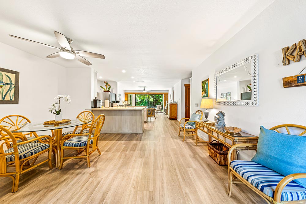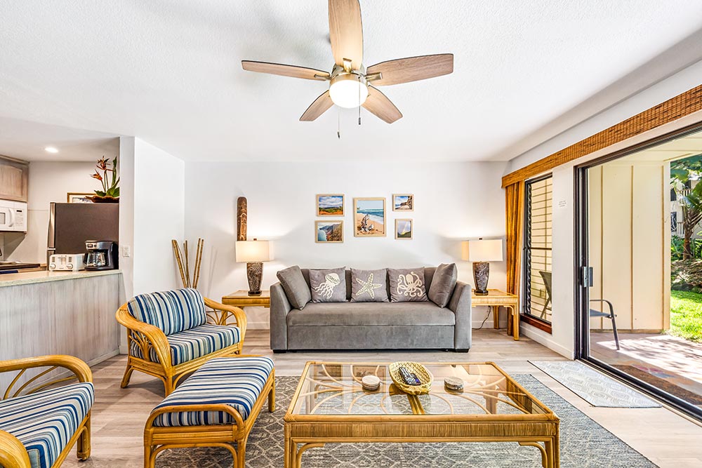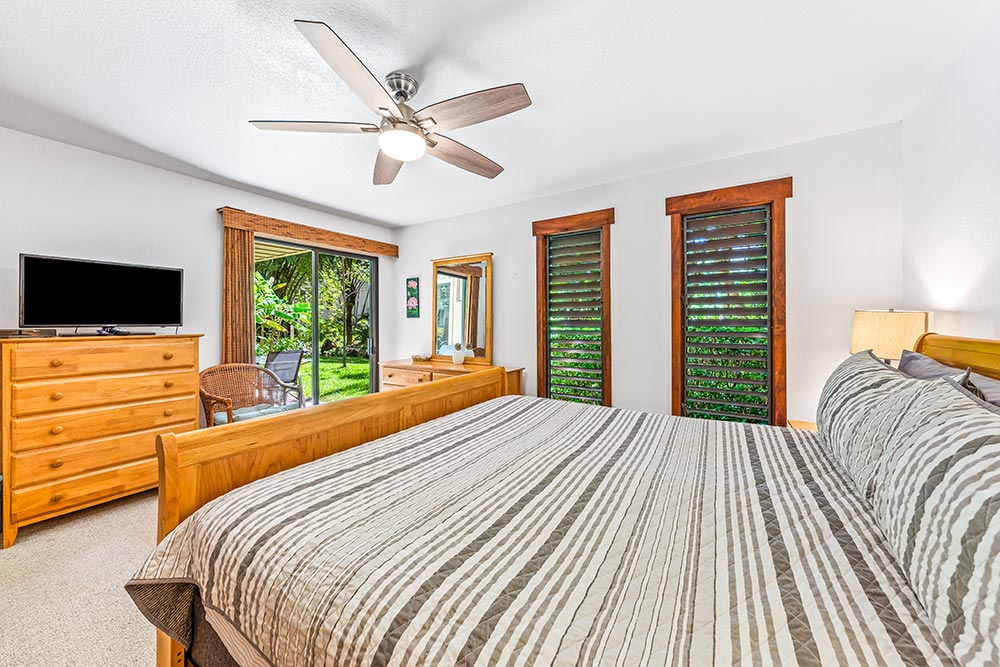 You will appreciate the open concept living space of our unit, with a lanai off the front and as well in the rear. We have two ceiling fans in the living room and in the bedroom, for your comfort. Waikomo has such a beautiful breeze that air conditioning is not needed. Listen to the birds, the waterfall and the frogs at night.